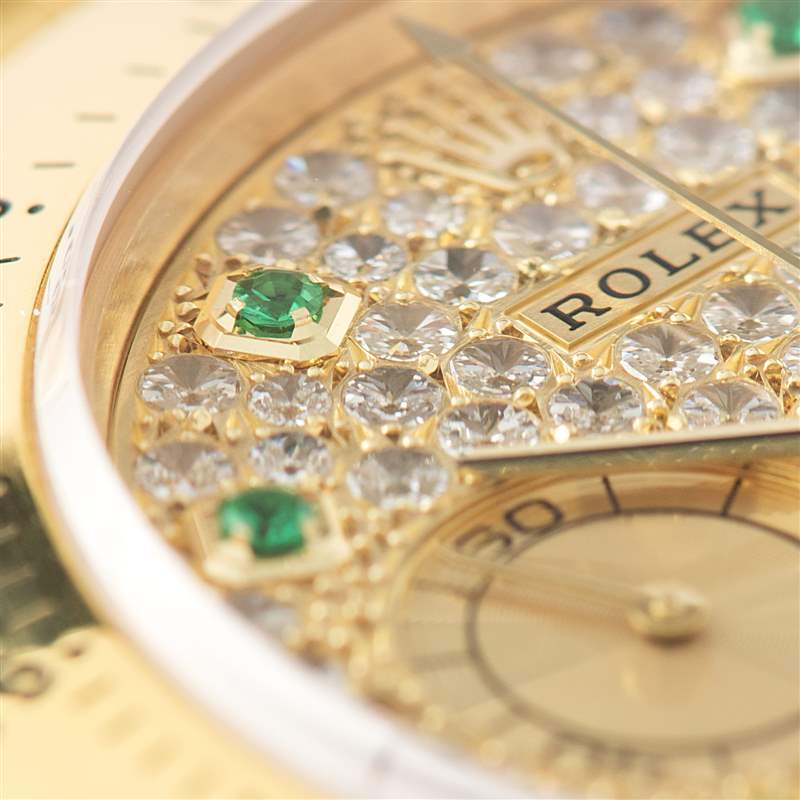 劳力士使用钻石装饰腕表,这一习俗始于20世纪50年代的某些蚝式腕表。有趣的是,虽然我们通常将宝石镶嵌与贵金属手表联系起来,但在那个时代,即星期-日期,在精钢6084或其他34毫米半气泡式的时标上也可能有一些微妙的钻石。然而,在1960年代早期至中期,宝石镶嵌艺术在劳力士真正脱颖而出,日历腕表推出宝石镶嵌表圈和全铺砌表盘。整个金光闪闪的东西一直延续到70年代,当时一些最令人难以置信的手表都生产出了多宝石镶嵌的表圈,表盘甚至手镯。