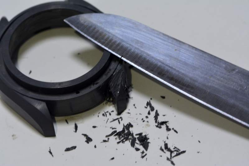 然后注塑成型:把搭配好的原材料搅拌成陶瓷浆料到机器里面注塑成型,然后需要用上百吨的液压机压缩成型。这道工序是非常的重要,如果原材料粉末有杂质、陶瓷浆料配方比例不对、压缩的力度和时间长度,都可能导致粗胚在烧结过程中出现很多的沙孔、裂痕,直接为废品。非常多的不确定因素,导致了陶瓷的不良品率是非常高的。第一次高温烧结:陶瓷粗胚要经过1400多摄氏度熔炉内等离子高温烧结,陶瓷会收缩硬化。第一次高温烧结后的壳身已经变硬了,手感有点像厚重塑胶的感觉,材料的变化真的很奇妙。为了跟大家说明陶瓷壳不存在掉色的情况,特地找来了切水果用的刀子。用力的壳耳的地方,削下来了一些黑色碎末,可以看到削下来的粉末和壳身内部都已经被高温从白色烧结成黑色的。在这里顺便说一下,VSPam441的陶瓷壳跟这款“深海之黑”的陶瓷壳的硬度是比大部分常见的金属的硬度还要高,划痕有可能是金属粉末沾在了陶瓷壳上,所以用湿毛巾或者细砂纸轻轻擦拭一下就好了。
