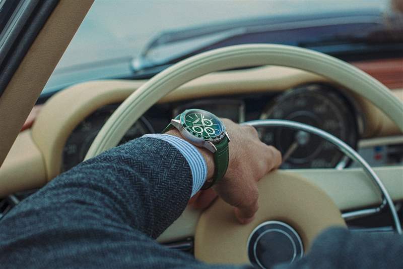 - 表壳/表盘:直径 43.5 毫米 x 高 13.7 毫米,不锈钢表壳,绿色陶瓷转速表圈,绿色拉丝表盘