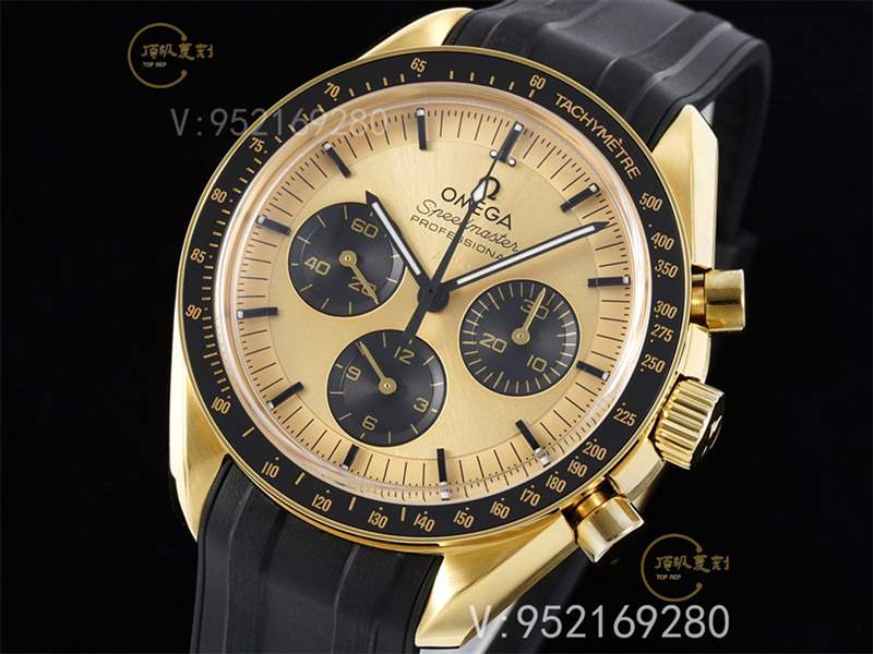 其中一款“阶梯式”表盘采用Moonshine 18K金制成,呈现太阳射线打磨效果。黑色陶瓷表圈上的测速刻度由OMEGA Ceragold 技术制成,并设有早期超霸表款的“Dot Over Ninety” (DON,刻度90的圆点位于数字上方) 标志。Moonshine 18K金小表盘覆以黑色,金质的时针和分针亦经黑色PVD处理。