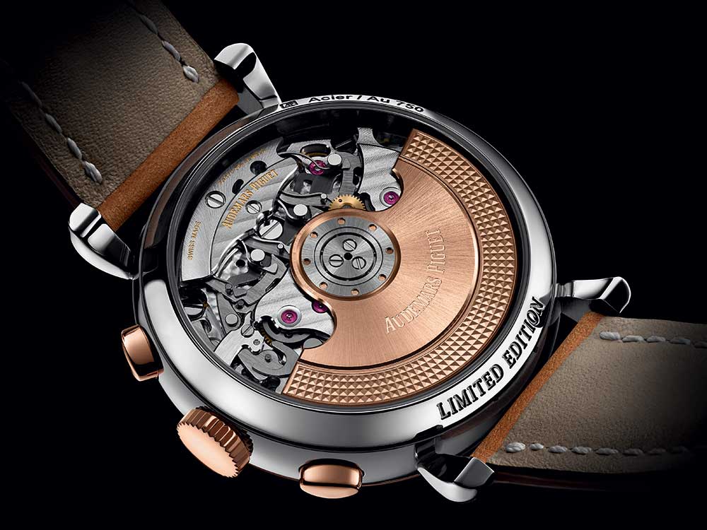 除了精致的金色调外,拉丝表盘还体现了爱彼1943年腕表的主要图形特征,如蓝色测速刻度和沿法兰运行的高精度分钟跟踪器,纤细的黑色印刷时标和数字12,以及玫瑰金棒式指针二重奏,可计时和运行分钟。然而,即使蓝色计时码表直接驱动仍位于中央,计数器布局也发生了变化。小秒针现在设在6点钟位置,分钟累加器(镌刻红色4/5,用于足球比赛中半场计时)设在9点钟位置,小时秒针设置在3点钟位置。