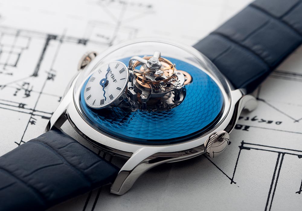 MB&F在2019年春季推出的第一款女性手表与众不同。这是完全可以理解的,因为它的非常规设计借鉴了品牌的密集创意世界。Legacy Machine FlyingT寻求既复杂又精致。中央飞行陀飞轮在令人印象深刻的20毫米高圆顶下以60秒的转速聚焦我们所有人的注意力。位于7点钟位置的低调白色漆面表盘倾斜至50°。它的蛇形指针显示小时和分钟。鉴于其位置,只有佩戴者才能看到它,其优雅的手腕上装饰着这款时计。