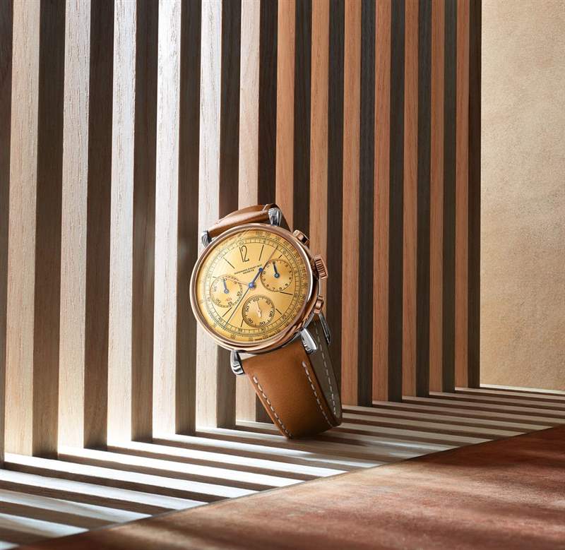 「[Re]master 01」全新自动上链飞返计时码表延续了1943年原创款的重点元素,圆形精钢表壳搭配泪滴形表耳,表圈、表冠、按钮与时分秒针皆为18K玫瑰金。