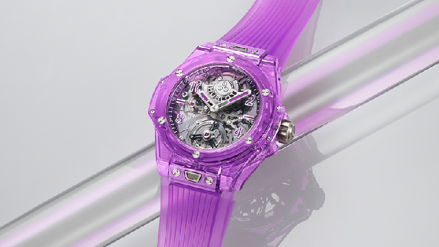 从2016年HUBLOT推出第一款蓝宝石水晶表款到现在,几乎是一年一个颜色在推陈出新,到目前已经有红橙黄绿蓝五种颜色,今年又新增了紫色。关于技术面HUBLOT向来都满神秘的不对细节加以详述,针对蓝宝石水晶表壳,品牌资料里说明是以氧化铝(Al₂O₃)和铬元素调制成的特殊比例,而除了调配出想要的颜色之外,熔点高、硬度强的材质特性,也增加了蓝宝石水晶的加工难度。