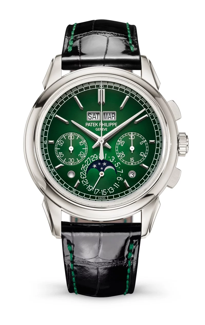 而延续近年来掀起的绿色热潮,今年编号5205R-011的自动年历月相玫瑰金腕表换上朝向周边渐变黑色的面盘,取代以往的黑面款。铂金款的编号5270P-014万年历计时码表,也以具有贵族气息的绿色涂漆表面展现黑色渐变效果,取代以往的铂金鲑鱼面款。女表部分,Twenty~4编号4910/1200A-011法式袖口石英腕表和编号7130R-014世界时区玫瑰金镶钻腕表,也都换上充满优雅复古风的橄榄绿色。
