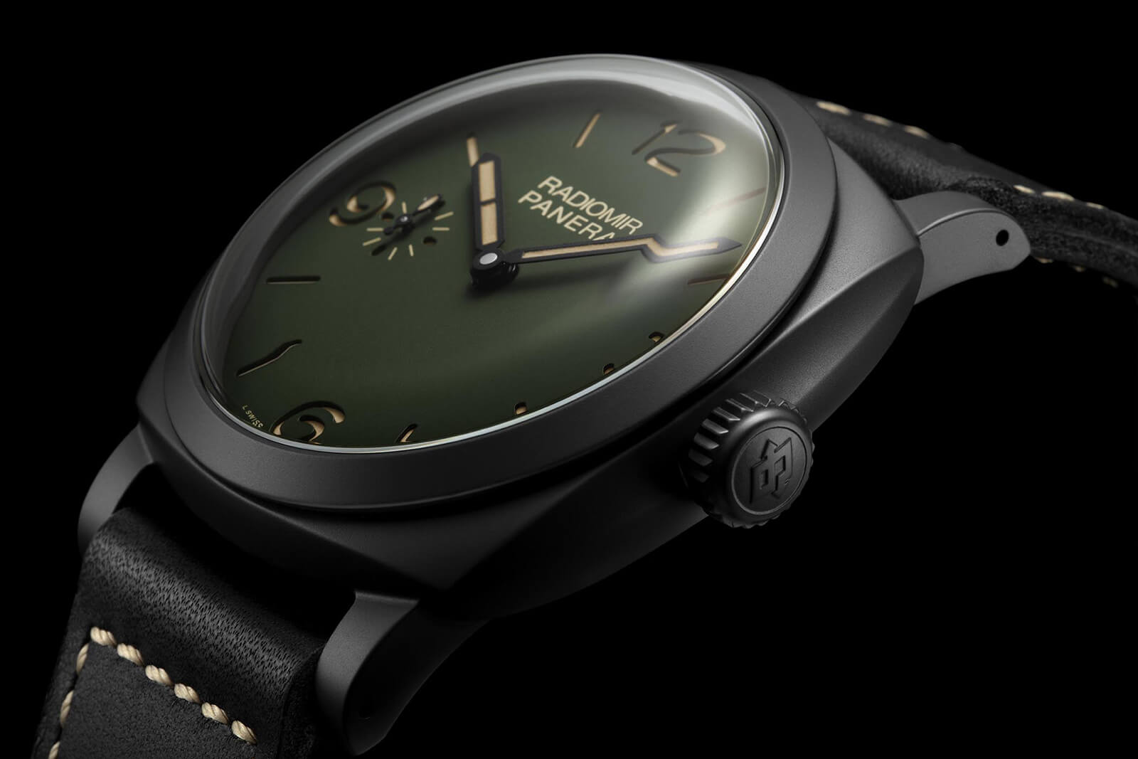 规格: 48mm 直径 x 16.12mm 高度,喷砂哑光黑色陶瓷表壳;100m (10 bar) 防水;自制 P.3000 机芯,手动上链;21,600 vph (3 Hz) 频率;3天动力储存;黑色小牛皮表带,附有米色帆布表带;12,900 欧元;沛纳海专卖店独家发售。