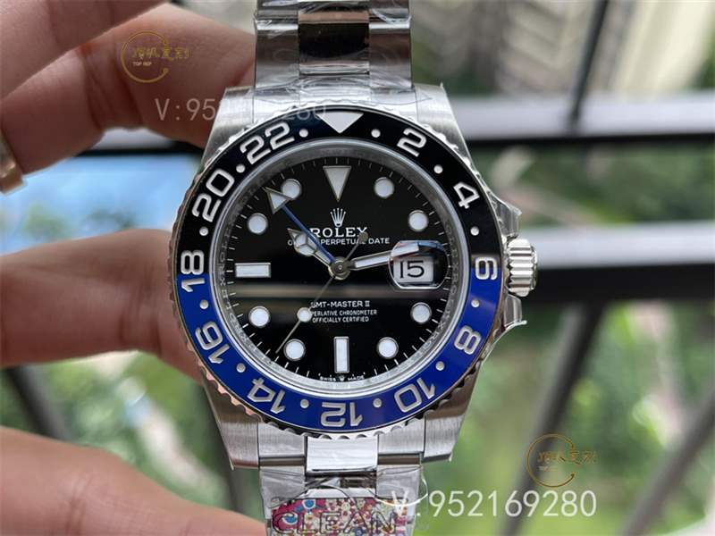 clean厂劳力士格林尼治,盘面的刻度填充非常均匀,指针形状大小都是对版的,盘面的字母大小粗细印刷到位,日历大小窗口也是对版的。