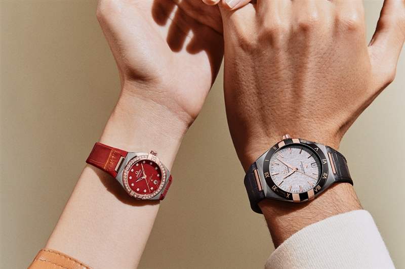 Omega这双情侣表吸引的地方在于美丽的名称与独特的造工,女士款式的是名为The Constellation Aventurine星座系列砂金石腕表,表盘是由天然砂金石打造,经品牌精工细琢,表面各有特色,所以每枚星座系列腕表的表面均独一无二,再配以18K Sedna™金及美钻潼饰,真真正正是一款专为女士而设的浪漫型腕表;而男士要配衬这女装表,可以挑选同是The Constellation星座系列的41mm款式腕表,选用18K Sedna™金配不锈钢打造表壳,令腕表在刚强气质之上,再添一份优美。而且这表的设计包括镶饰光面托爪的黑色陶瓷表圈,配铑灰色丝质压纹表面,日历窗上方亦缀饰一颗星座系列星徽标志等,平日只戴全精钢运动表的你,不妨试试这以优美浪漫为主题的腕表,展现你有爱的一面吧。