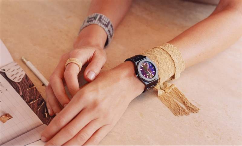 Carolina Bucci这位设计师是何许人也?霜金这种出现在皇家橡树表系的黄金锤击工艺,就是在2016那年透过她与爱彼的通力合作,实现应用在爱彼皇家橡树系列上,「我想让彩虹出现在最令人意想不到之处,仿如都市街道水漥中的浮油幻彩效果。在原本毫无色彩的黑色画布上,闪现色谱上的所有色彩。」这位出生义大利珠宝世家的设计师如此描述她在着手设计这只特别版表款时的想像。乍看是黑色表面,但会随着周遭光线变化而泛映七彩虹光,为创造出这种效果,需在表面的黄铜底板上增添一片以微结构技术刻上小方块的蓝宝石水晶玻璃,缔造泛映七彩虹光的效果;接着再以专门开发的工艺在蓝宝石水晶玻璃的背面镀上金膜,达到镜面效果,照亮表面。呈现出来的虹彩效果因表面而异,因此每一枚表面都独一无二。