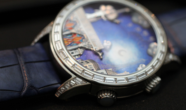 我们孤独的姑娘站在同一座埃菲尔铁塔上的女士装。背景是巴黎圣母院——配有彩色玻璃窗。这些手表旨在作为故事中男人和女人的视角。表盘是华丽的作品。完全手工制作,每件都经过数小时的雕刻、绘画、成型和镶嵌。一个表盘可能需要数周或数月才能完全完成。表盘大多采用金质雕刻,搭配珐琅工艺、珍珠母贝雕刻和微绘。
