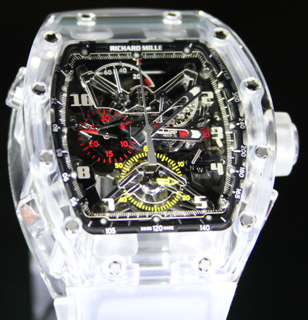 手表的全称是 RM 056 Felipe Massa 蓝宝石陀飞轮双秒追针竞赛计时码表。除了百慕大的一所房子,我不确定这只手表在与什么竞争。这个概念实际上非常令人印象深刻。从几年前开始,我开始向业内人士询问制作全蓝宝石水晶表壳的可行性。他们说这是可能的,但很痛苦。基本上切一块又扁又圆的蓝宝石水晶是最简单的。一旦你开始做曲线和角度以及更大的复杂零件,它就会变得复杂、耗时和令人沮丧。