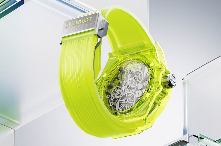 ▲宇舶应用航太工业常用的蓝宝石氧化铝及稀土矿物SAXEM制作Big Bang陀飞轮表壳,此次品牌全新调配出萤光黄色让人眼睛一亮。