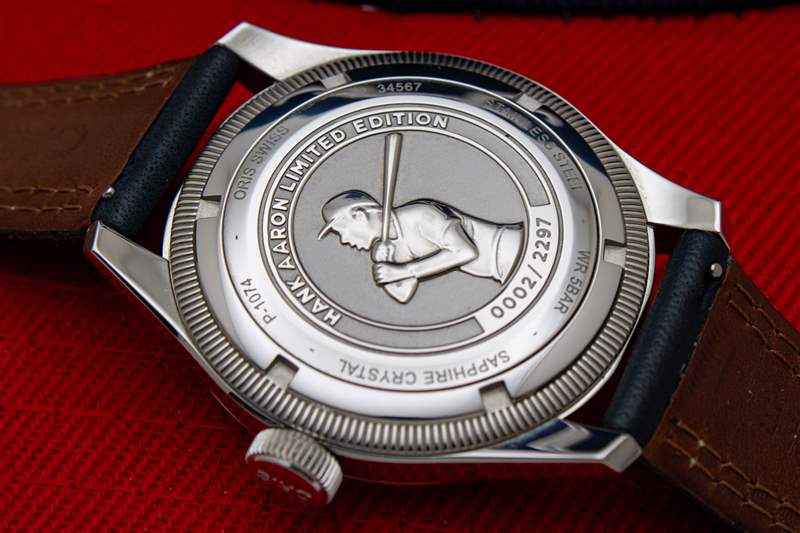 Oris Hank Aaron 限量版内部搭载基于 Sellita 的 Oris Calibre 754 自动机芯。754 机芯长期以来一直是大表冠指针日期系列的主打产品,虽然它可能提供可靠的性能,但它也开始有些老化了。在充满大型主发条和内部动力装置的世界中,每小时 28,800 次跳动的 38 小时动力储存显得尤为不足,但这些机芯的可靠性和易于维修性也不容忽视。豪利时 (Oris) 为 Hank Aaron 限量版腕表增添了深海军蓝色皮革表带。这款表带采用白色双缝线,与经典棒球手套的外观相呼应,提供了我在这个价位的皮革表带中见过的最好的质感和细节,同时巧妙地强化了 Hank Aaron 主题。Oris 还包括红、白、