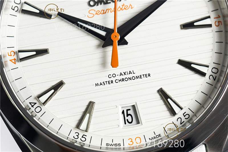 VS厂欧米茄海马Aqua150复刻版白面橙色秒针,相比金针队长没有那么丰富的色彩元素,属于“闷骚”类型的。腕表采用的简约柚木表盘,柚木的设计理念是欧米茄在2008年引入于Aqua Terra腕表中,这也成为Aqua Terra腕表的标志性特征之一,最直接体现在盘面水平的纹理,人们第一眼看到它,很容易联想到游艇木质甲板的奢华质感。简单的大三针与三角形小时刻度的设计,也是为了致敬早期欧米茄腕表的设计风格。