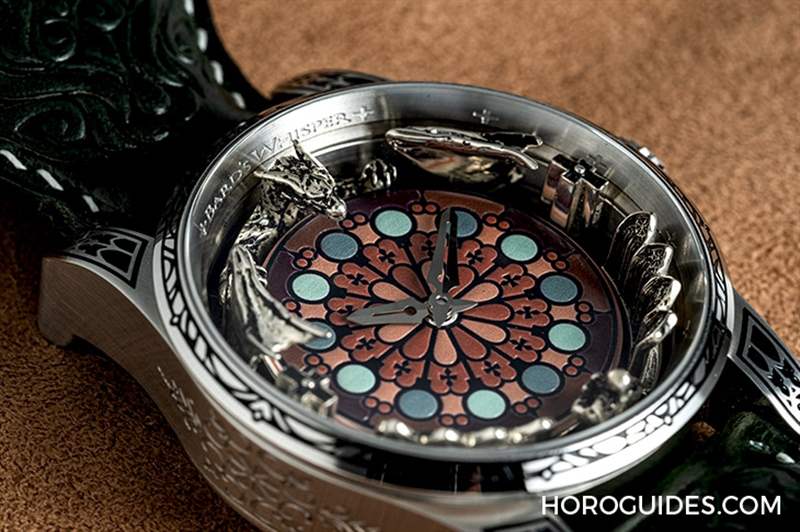 于是表款的面盘化为360度全视野的微缩环景舞台,12点钟位置栖息着一头高举双翼的巨龙,巨大的翼展延伸近半个面盘,作势威吓要吞噬天地;而6点钟位置与之抗衡的,就是昂首挺胸、身着骑士盔甲的圣乔治,在两侧教堂窗花的护法之下,象征着正义一方的光明力量。