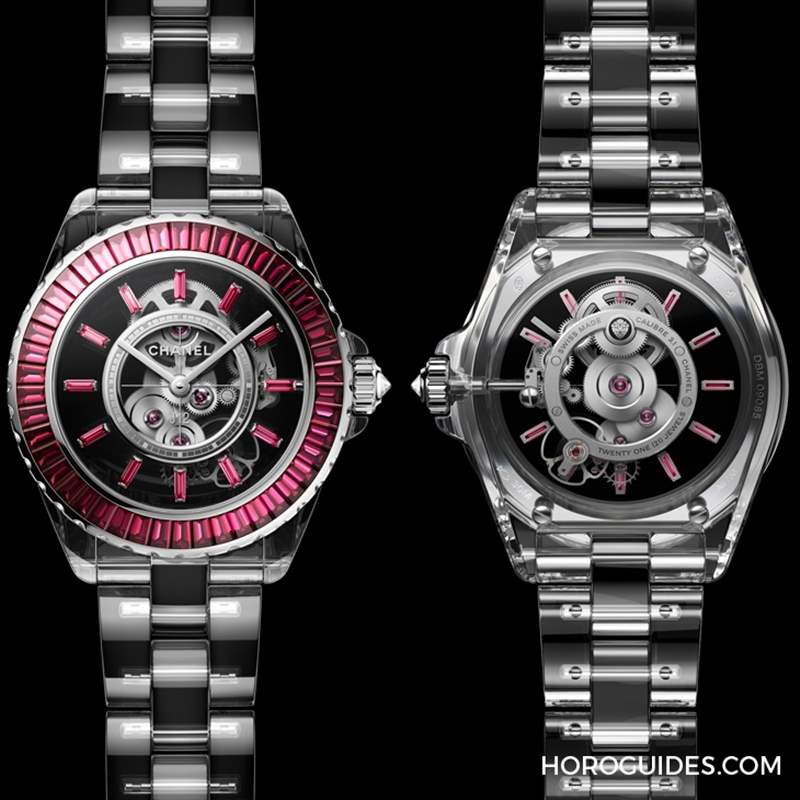 2022年,CHANEL为这款纯净通透的表款注入醒目的红色,将梯形切割红宝石镶嵌于表圈与时计,透明与鲜红的对比更加凸显出J12的经典轮廓曲线。换个角度,从表背欣赏,隐隐可欣赏到时标所镶嵌的红宝石,那鲜明难掩的夺目魅力恰与机芯红宝石轴承连成了另一番赏析风景。