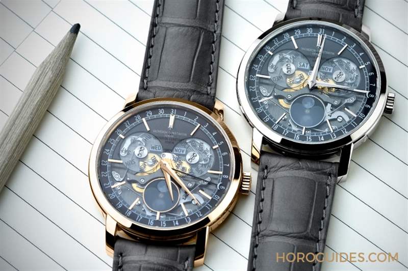 表径41mm的Traditionnelle全日历腕表,具备此系列的识别性特色-阶梯式圆形表壳、凹槽底盖、纤细表圈、轨道式分钟刻度圈、双刻面太妃针与金质时标。表盘由三部分组成—乳光暗灰色外圈,设有中央日期指标;暗灰色表盘,顶部饰有机刻雕花(guilloché)图案;覆以透明的蓝宝石水晶表盘,并点缀金质镶贴时标。表盘下还有两个蓝宝石水晶圆盘,分别显示星期和月份。