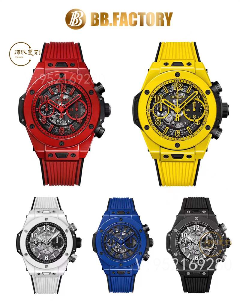 BBF厂全新突破彩色陶瓷问世 HUBLOT 宇舶表BIG BANG Unico 大爆炸系列彩色陶瓷腕表,陶瓷工艺史无前例的重大突破,砸重金耗时四年,得以突破传统的陶瓷材料。全新彩色陶瓷采用精湛的技术,将高压力和高热相融合,无需烧制颜料就能锻造陶瓷。这一全新的陶瓷材质拥有高密度的特性,在此之前,行业尚未在陶瓷材质的工艺技术和美学方面获得如此突破。BBF对每一道工序均精益求精,精心打造该特殊陶瓷表壳的每一个部件。BBF为掌握此项技术历经四年时间潜心研发,不遗余力地在对材料的探索路上砥砺前行。目前这项发明的技术 为BBF所独有 标配定制恒宝专属UNICO HUB 1280自动飞返计时机芯,3字位镂空日历环,3字盘60分钟计时,(注:市面7750机芯均只能计时30分钟)8字位水平离合、9字位小秒轮、蓝宝石水晶表镜、橡胶表带搭配陶瓷折叠表扣,七彩纹指针质感无可挑剔 45mm 全部功能100%完美实现,天花板级别,欢迎玩家品鉴(BBF出品 必属精品)