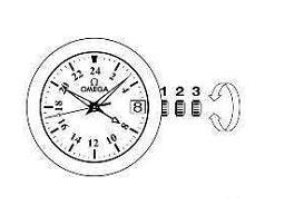 同步校准手表时针及“24小时”指针后,务必将手表设定至当地时间,然后将表冠按回位置1。