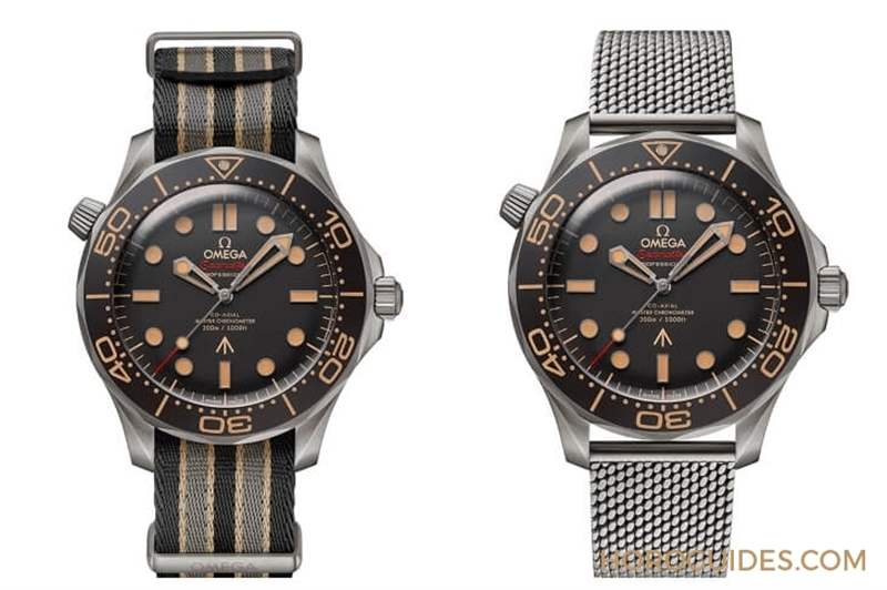 腕表表壳使用欧米茄自家实验室制作的轻质2级钛金属,表圈则是搭配铝圈,此组合让上手感受更显轻盈。面盘配有「热带tropical」棕色表盘和独特的军事标记。此表款共推出二种款式,分别搭配上钛金属米兰链带,或是深棕色、灰色与米色条纹相间的NATO表带;NATO表带的固定环上也镌刻着「007」字样。购入此表时将配有独家棕色布质表袋。