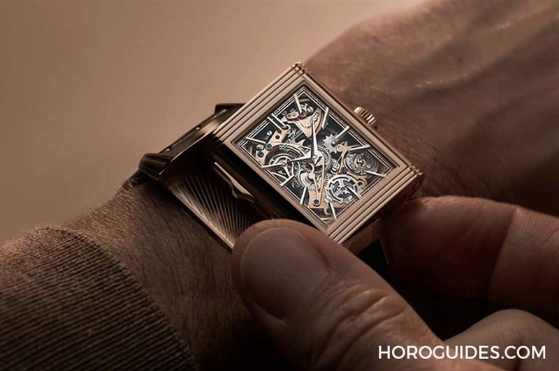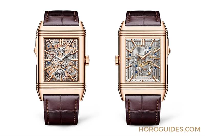 具备强烈视觉张力的正面镂空面盘与Reverso翻转系列经典方形表壳产生鲜明对比,而相对低调的背面表盘则强调腕表笔直的线条,主机板亦是表盘的一部分,整个表面均点缀垂直日内瓦波浪饰纹,蓝钢螺丝以及金色指针和时标成为冷银色调金属表盘上的精致点缀,在表壳温暖的玫瑰金色调衬托下更显精巧。