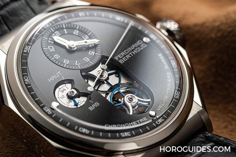 CHRONOMÉTRE FB 1从2016年问世以来,已经推出几个设计风格不同的延伸款式,包括以18K白金打造的FB 1.1,以18K玫瑰金打造的FB 1.2,以950铂金打造的FB 1.3,还有以钛合金打造的FB 1.4。FERDINAND BERTHOUD运用不同的材质搭配美学风格和修饰工艺,来诠释CHRONOMÉTRE FB 1。这次报导的两款作品,其中一款黑色面盘的FB 1.4是CHRONOMÉTRE FB 1表款的轻盈升级版本,钛合金打造轻量化表壳搭配黑色清漆面盘,内部所搭载的FB-T.FC-2机芯则采用蓝宝石水晶夹板,可透视机芯的整个构造,强化了表款的轻盈特质及现代精神,俐落简约的设计风格,展现卓越的当代风范。