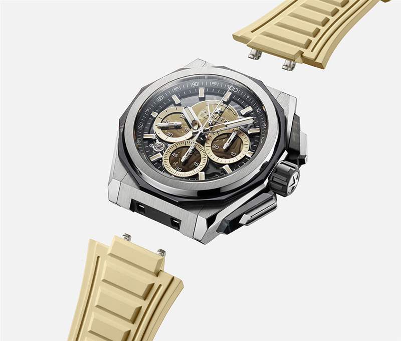 Defy Extreme Desert佩戴在钛腕带上。这可以替换为包装盒中提供的米色橡胶表链或黑色魔术贴®表带。