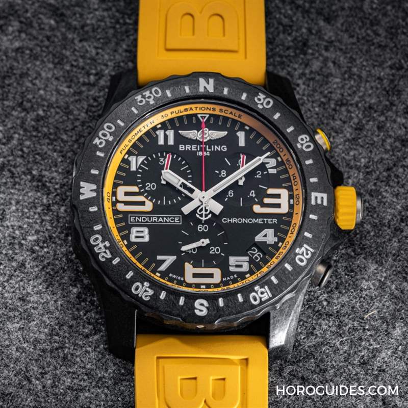 百年灵的Endurance Pro就实现了上述的种种条件。据品牌表示,Endurance Pro设计的灵感是来自1970年代品牌的Sprint腕表,当时Sprint为求轻盈表身,因此是以树脂制作表壳,搭配能测量心跳速率的脉搏计计时功能。而2020年的Endurance Pro继承了为热爱运动的人打造腕表的想法,轻盈的手感来自于百年灵专利的Breitlight®材质,这种碳基复合材料重量极轻,比钛金属轻3.3倍、更比不锈钢轻5.8倍,因此上手可以非常明显的感受到优异的轻巧度,即便搭配的是橡胶表带,整体也完全不会有表头过重、头重脚轻的不平衡感,可想而知即便久戴、或是运动时手部不停摆动,也不会感到负担。