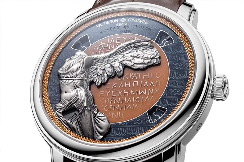 第三枚时计,江诗丹顿凭借来自萨莫色雷斯的胜利女神雕像,转向了希腊历史的希腊化时期。Victory,也被称为耐克,是广阔的希腊万神殿中的一员,与标志性的奥林匹亚众神并列。人们相信,Victoire de Samothrace 是为了纪念希腊在海上取得的一次重要胜利,因为女神被描绘成站在船头上,而雕像是在北爱琴海萨莫色雷斯岛上的一座寺庙建筑群中发现的。许多重要的海战。